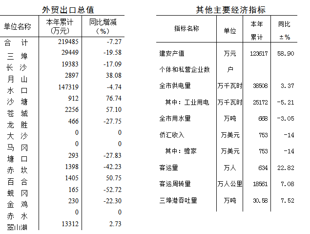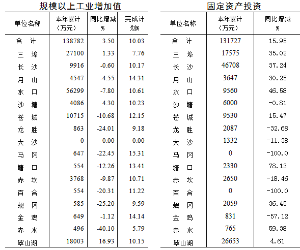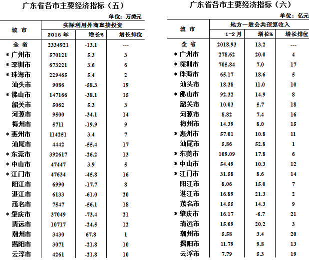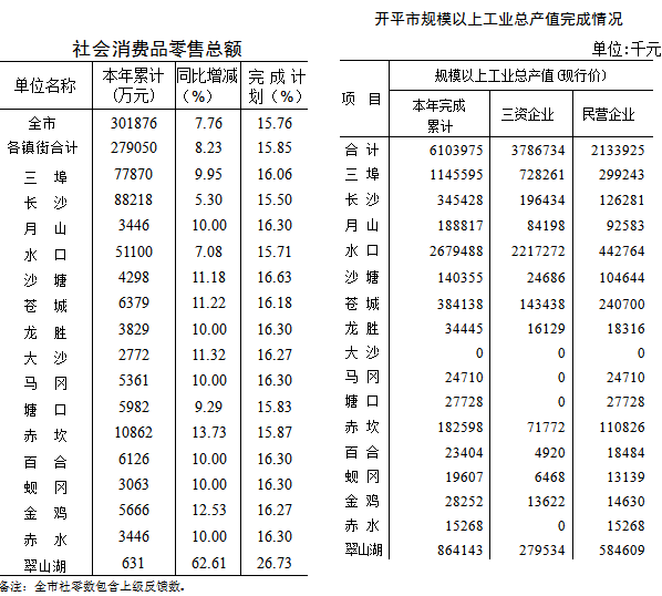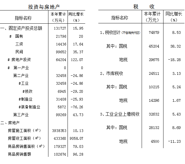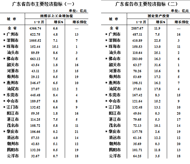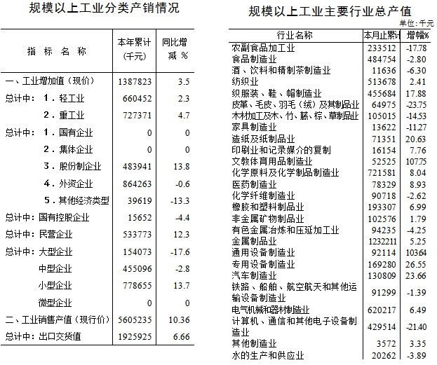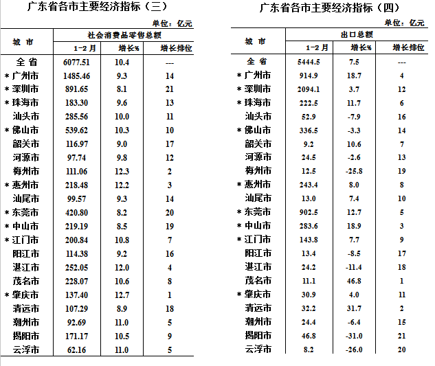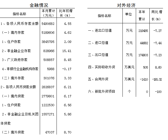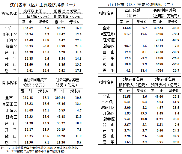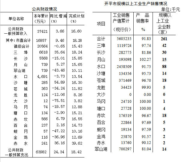 (来源:开平市统计局) 经济运行概况 一、工业平稳增长 2月,我市规模以上工业增加值13.88亿元,同比增长3.50%。总计中:股份制企业增加值4.84亿元,同比增长13.8%;外资企业增加值8.64亿元,同比下降0.6%。工业销售产值56.05亿元,同比增长10.36%。总计中:出口交货值19.26亿元,同比增长6.66%。 二、财政、金融平稳增长 2月,我市地方公共财政预算收入累计37421万元,同比增长3.66%;公共财政预算支出63982万元,同比增长24.34%。金融机构存款余额549.07亿元,比年初增长4.55%,其中住户存款余额384.58亿元,比年初增长2.09%,各项贷款余额282.68亿元,比年初增长6.21%。 三、固定资产投资平稳增长 2月,全市固定资产完成投资额131727万元,同比增长15.95%。其中房地产完成投资64204元,同比增长122.07%。 四、社会消费平稳增长 2月,我市社会消费品零售总额301876万元,同比增长7.76%。