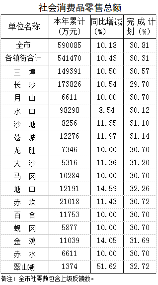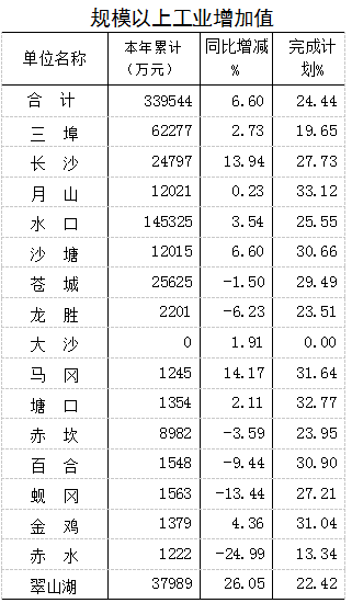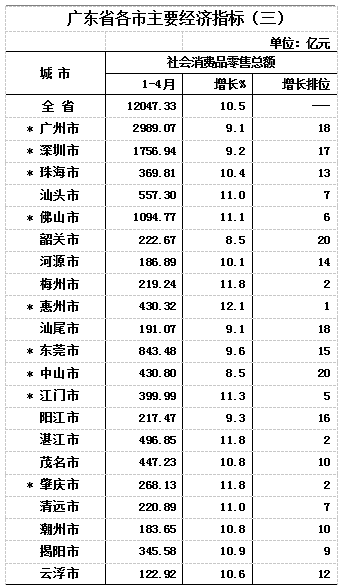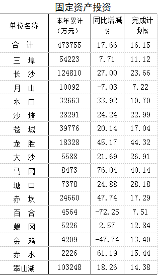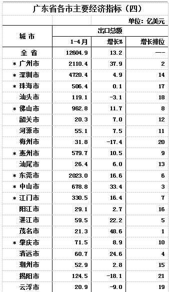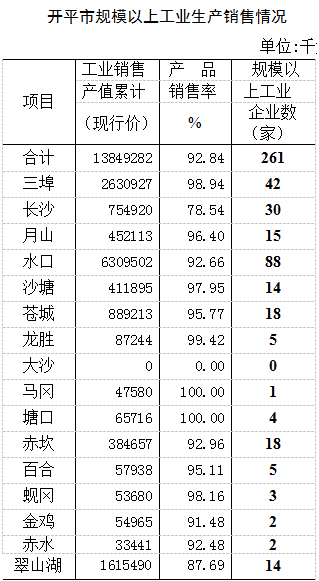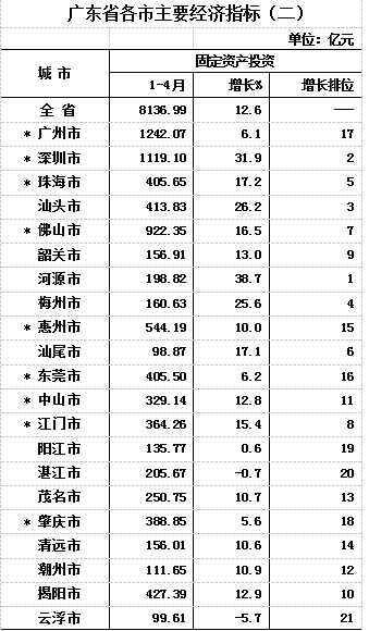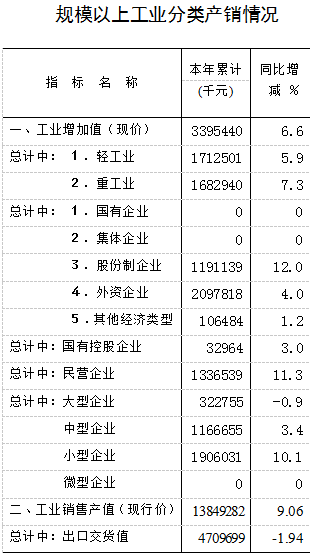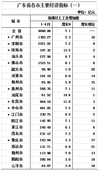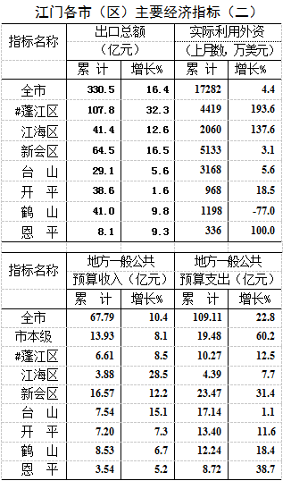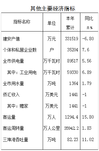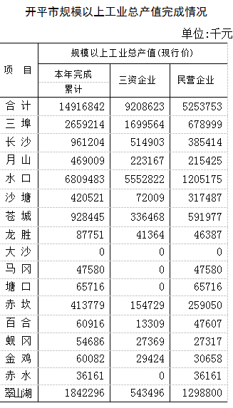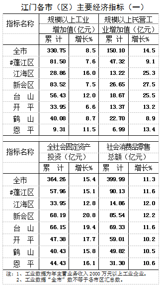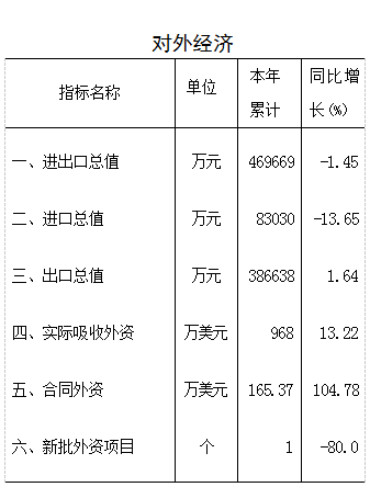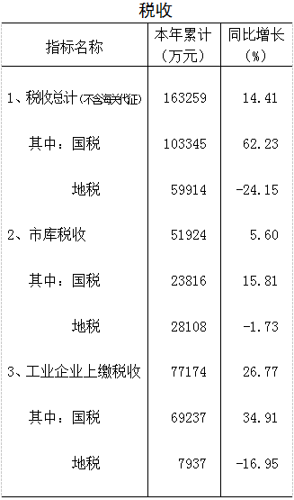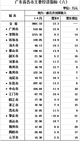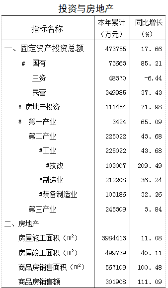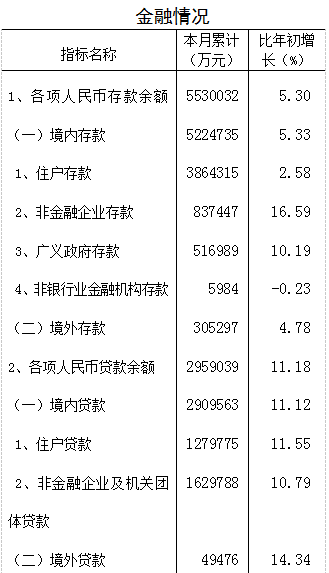 (来源:开平市统计局) 经济运行概况 一、工业增幅较小 4月,我市规模以上工业增加值33.95亿元,同比增长6.60%。总计中:股份制企业增加值11.91亿元,同比增长12.0%;外资企业增加值20.98亿元,同比增长4.0%。工业销售产值138.49亿元,同比增长9.06%。总计中:出口交货值47.1亿元,同比下降1.94%。 二、财政、金融平稳增长 4月,我市地方公共财政预算收入累计71998万元,同比增长7.33%;公共财政预算支出133958万元,同比增长11.61%。金融机构存款余额553亿元,比年初增长5.30%,其中住户存款余额386.43亿元,比年初增长2.58%,各项贷款余额295.90亿元,比年初增长11.18%。 三、固定资产投资大幅增长 4月,全市固定资产完成投资额473755万元,同比增长17.66%。其中房地产完成投资111454万元,同比增长71.98%。 四、社会消费平稳增长 4月,我市社会消费品零售总额590085万元,同比增长10.18%。
