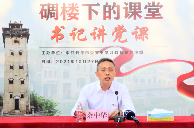 10月27日,开平市在赤坎南楼纪念公园开展“碉楼下的课堂——书记讲党课”活动。市委书记余中华以“锤炼忠诚干净担当的政治品格  以实干实绩推动开平经济社会高质量发展”为主题,为党员干部上了一堂专题党课。江门市委党史学习教育第五巡回指导组组长张杜明,市领导伍德斌、陈杰文、黄惠红、周宝珠,以及开平市中青年干部培训一班学员、本次换届各镇街30岁以下新进领导班子干部参加了活动。