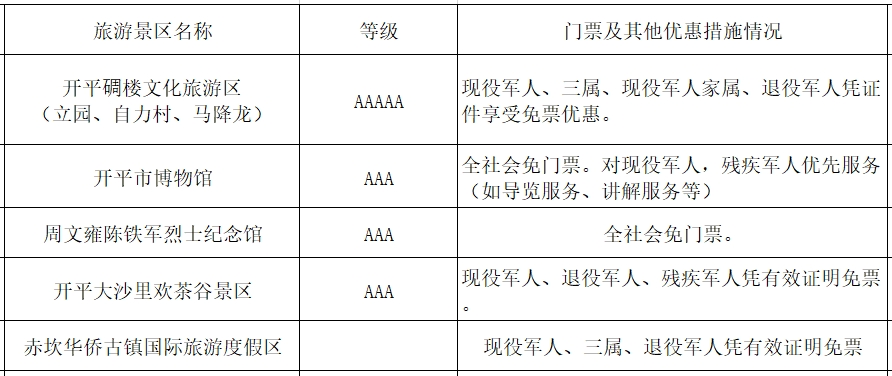 近年,开平市大力建设“邑美侨乡·世遗风韵”乡村振兴示范带,加快推进“梦回开平·华海侨韵”夜经济项目建设运营落地,科农文旅深度融合,优待政策日益丰富。据统计,全市共有5家A级以上景区面向全国退役军人和其他优抚对象提供优待服务,希望吸引全国战友到开平全域旅游。赤坎古镇工作人员表示:“我们景区很荣幸能够接待来自全国五湖四海的老兵,门票虽然免费,但服务绝对不打折扣。”