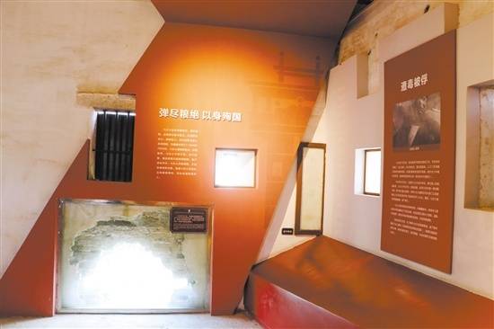 在南楼内拾级而上,墙上随处可见枪弹痕和炮弹孔,受损最严重的是一扇被炸毁的铁窗和一堵墙,被日军炮火轰开的大豁口宽可通人。在一处射击孔旁边,可以清晰看见队员们当年与日军血战时挥毫写下的姓名。