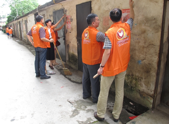 6月28日下午,在市发改局党支部书记邓毅斌同志亲自带领下,二十多名党员志愿者带上扫把、铁铲、刷子、水桶等清洁工具,到达新昌中路(味事达附近路段),清理“牛皮癣”近百张,认真清扫街道和公路边的生活垃圾,清理街巷及住宅楼下的卫生死角十多处。经过近一小时的努力,整条街道焕然一新,干净整洁,带给社区居民卫生、舒适的居住环境。