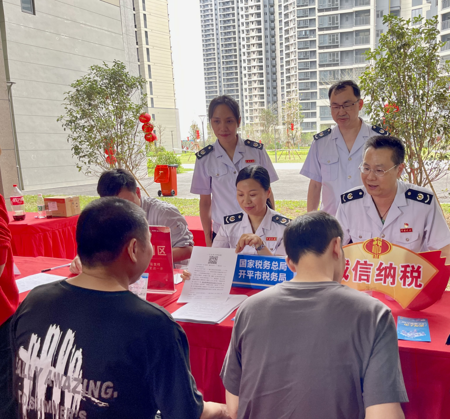 为进一步提高全民诚信纳税的意识,2023年4月,开平市税务局走进开平融创潭江首府楼盘开展税务宣传志愿服务活动。