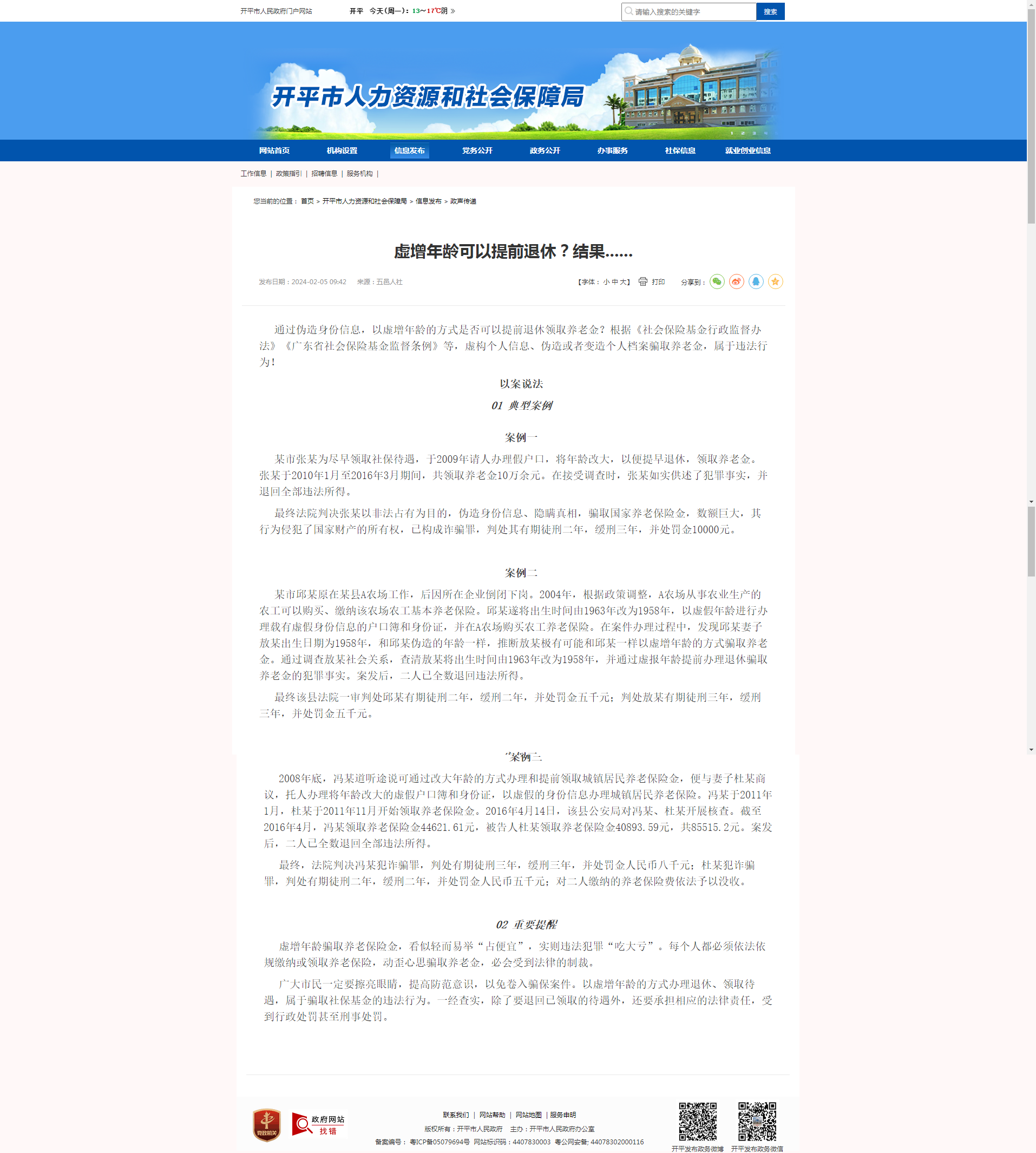 2024年2月5日,开平市人力资源和社会保障局通过门户网站转载关于虚构年龄提前退休的后果等的相关内容,向群众宣传诚信守法、自觉抵制起止骗保行为。