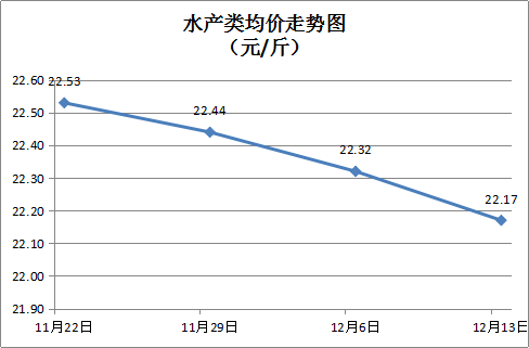 水产类商品价格总体略降。所监测的11种水产品综合均价为22.17元/斤,环比下降0.67%。其中:草鱼、鲫鱼、鳙鱼、基围虾零售均价分别为每斤11.43元、13.50元、10.22元、35.25元,环比分别上涨0.35%、下降1.82%、持平、下降0.59%。