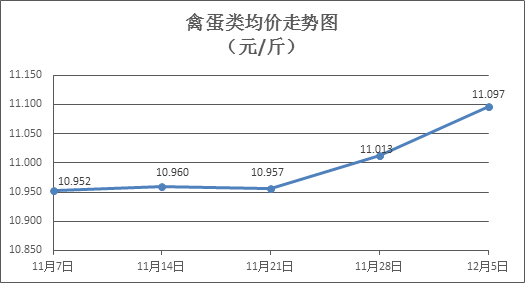 禽蛋类商品价格微幅上涨。本周所监测的6种禽蛋类商品价格波动情况为5涨1跌,综合零售均价为11.097元/斤,环比上涨0.76%。其中:白条鸡、白条鸭零售均价分别为每斤20.61元、15.54元,环比分别上涨0.88%、上涨1.57%;白壳鸡蛋、鸭蛋零售均价分别为每斤7.26元、7.66元,环比分别上涨0.83%、下降0.13%。