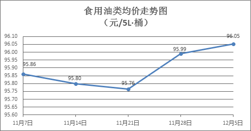 食用油类商品价格微涨。本周所监测的9种食用油(5L装)商品价格波动情况为5涨3跌1平,综合零售均价为96.05元/桶,环比上涨0.07%。其中:鲁花花生油、玉米油零售均价分别为每桶159.17元、74.61元,环比分别上涨0.37%、上涨0.09%。