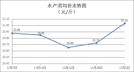 水产类商品价格以涨为主。本周所监测的10种水产商品价格波动情况为9涨1跌,综合均价为21.03元/斤,环比上涨1.47%。其中:草鱼、鳙鱼、罗非鱼、基围虾零售均价分别为每斤11.61元、10.99元、8.76元、38.76元,环比分别上涨2.83%、上涨1.01%、上涨0.57%、上涨3.28%。