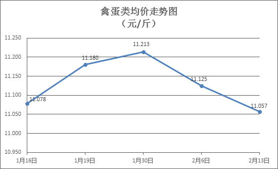 禽蛋类商品价格整体下降。本周所监测的6种禽蛋类商品价格波动情况均有所下降,综合零售均价为11.057元/斤,环比下降0.61%。其中:白条鸡、白条鸭零售均价分别为每斤20.29元、15.40元,环比分别下降0.83%、下降0.19%;白壳鸡蛋、鸭蛋零售均价分别为每斤7.21元、7.85元,环比分别下降0.41%、上涨0.25%。