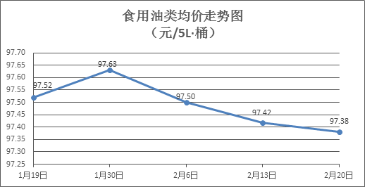 食用油类商品价格小幅波动。本周所监测的9种食用油(5L装)商品价格波动情况为2涨4跌3平,综合零售均价为97.38元/桶,环比下降0.04%。其中:鲁花花生油、金龙鱼调和油零售均价分别为每桶158.99元、71.39元,环比分别下降0.10%、下降0.21%。