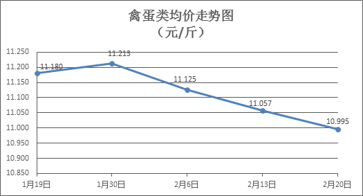 禽蛋类商品价格主降。本周所监测的6种禽蛋类商品价格波动情况为1涨4跌1平,综合零售均价为10.995元/斤,环比下降0.56%。其中:白条鸡、白条鸭零售均价分别为每斤20.06元、15.43元,环比分别下降1.13%、上涨0.19%;白壳鸡蛋、鸭蛋零售均价分别为每斤7.12元、7.83元,环比分别下降1.25%、下降0.25%。