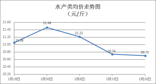 水产类商品价格涨跌互现。本周所监测的10种水产商品价格波动情况为4涨3跌3平,综合均价为20.70元/斤,环比下降0.20%。其中:草鱼、鲫鱼、鲈鱼、基围虾零售均价分别为每斤11.32元、14.18元、19.36元、38.35元,环比分别持平、上涨0.85%、下降1.07%、下降0.72%。