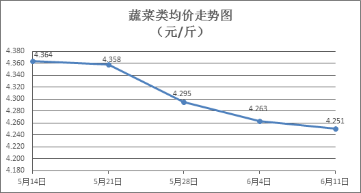 蔬菜类商品价格升降互现。上周所监测的32 种蔬菜商品价格波动情况为14涨17跌1平,综合零售均价为4.251元/斤,环比下降0.30%。其中:涨幅居前的品种包括莲藕、椰菜、西芹,零售均价分别为每斤4.69元、2.52元、4.89元,环比分别上涨3.30%、3.28%、3.16%;跌幅居前的品种包括水空心菜、奶白菜、苦瓜,零售均价分别为每斤3.36元、3.99元、4.31元,环比分别下降6.15%、3.16%、2.93%。