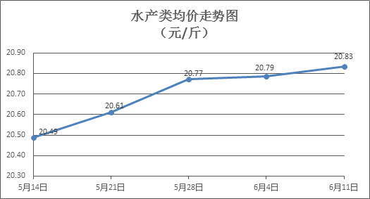 水产类商品价格窄幅盘整。上周所监测的10种水产商品价格波动情况为6涨3跌1平,综合均价为20.83元/斤,环比上涨0. 24%。其中:草鱼、鲢鱼、鳙鱼、罗非鱼、基围虾零售均价分别为每斤10.99元、9.80元、10.16元、8.39元、39.26元,环比分别下降0.45%、上涨1.03%、上涨0.89%、下降0.59%、下降0.28%。