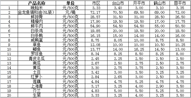 说明:1、表中价格为该地区监测点综合平均价;2、“市区”含蓬江区、江海区、新会区,价格分别采自蓬江市场、江南市场、城东市场等13家农贸市场;3、其他四个县市价格分别采自新华市场、锦江市场等8家农贸市场。
