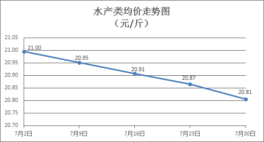 水产类商品价格延续降势。上周所监测的10种水产商品价格波动情况为2涨7跌1平,综合均价为20.81元/斤,环比下降0. 29%。其中:草鱼、鲢鱼、鳙鱼、罗非鱼、基围虾零售均价分别为每斤11.00元、9.85元、10.21元、8.34元、37.07元,环比分别下降0.54%、下降0.71%、下降0.29%、下降0.95%、下降1.44%。