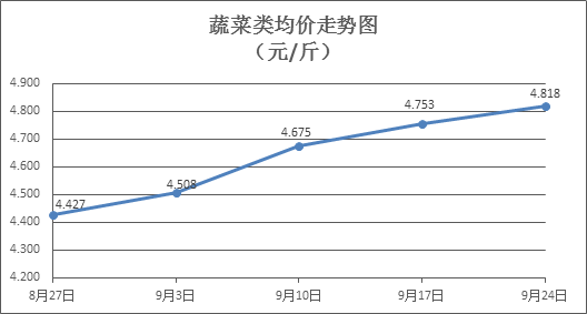 蔬菜类商品价格总体略涨。上周所监测的32 种蔬菜商品价格波动情况为18涨12跌2平,综合零售均价为4.818元/斤,环比上涨1.36%。其中:涨幅居前的品种包括西洋菜、白苋菜、丝瓜,零售均价分别为每斤5.53元、4.66元、4.81元,环比分别上涨16.18%、8.62%、4.11%;跌幅居前的品种为黄瓜、南瓜、土豆,零售均价为每斤3.94元、2.60元、3.30元,环比分别下降3.19%、2.26%、1.79%。
