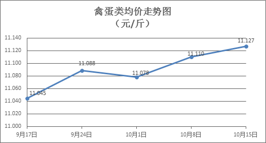 禽蛋类商品价格总体略涨。上周所监测的6种禽蛋类商品价格波动情况为4涨2跌,综合零售均价为11.127元/斤,环比上涨0.15%。其中:白条鸡、白条鸭零售均价分别为每斤19.88元、15.54元,环比分别上涨0.45%、下降0.26%;白壳鸡蛋、鸭蛋零售均价分别为每斤7.09元、8.13元,环比分别上涨0.57%、下降0.12%。