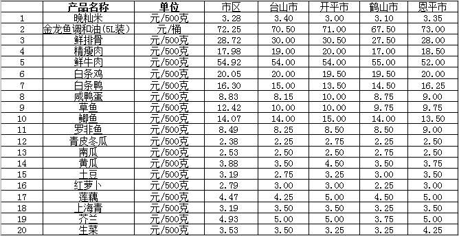 说明:1、表中价格为该地区监测点综合平均价;2、“市区”含蓬江区、江海区、新会区,价格分别采自蓬江市场、江南市场、城东市场等13家农贸市场;3、其他四个县市价格分别采自新华市场、锦江市场等8家农贸市场。