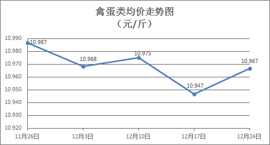 家禽类商品价格略有回升。上周所监测的6种禽蛋类商品价格波动情况为3涨3跌,综合零售均价为10.967元/斤,环比上涨0.18%。其中:白条鸡、白条鸭零售均价分别为每斤19.69元、15.41元,环比分别上涨0.51%、上涨0.26%;白壳鸡蛋、鸭蛋零售均价分别为每斤6.77元、8.02元,环比分别下降0.15%、下降0.25%。