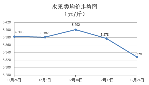 水果类商品价格小幅下降。上周所监测的6种水果商品价格波动情况为4跌2平,综合零售均价为6.328元/斤,环比下降0.78%。其中苹果、香蕉、葡萄零售均价分别为每斤7.20元、2.93元、12.99元,环比分别下降0.96%、下降1.01%、下降0.99%。