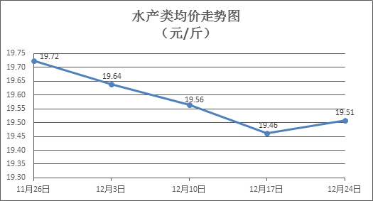 水产类商品价格有所回升。上周所监测的10种水产商品价格波动情况为6涨2跌2平,综合均价为19.51元/斤,环比上涨0.24%。其中:草鱼、鲫鱼、罗非鱼、基围虾零售均价分别为每斤10.96元、14.06元、8.51元、32.57元,环比分别持平、上涨1.22%、上涨0.71%、上涨0.90%。