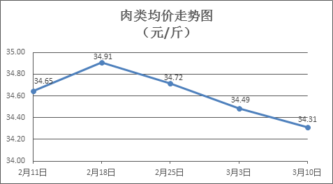 肉类商品价格微幅下降。上周所监测的8种肉类商品价格波动情况为1涨7跌,综合零售均价34.31元/斤,环比下降0.51%。其中:排骨、精瘦肉、有皮上肉、牛肉、带骨羊肉零售均价分别为每斤29.70元、18.45元、14.75元、53.65元、44.86元,环比分别下降0.83%、下降0.91%、下降0.94%、下降0.43%、下降0.47%。