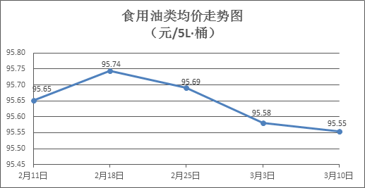 食用油类商品价格微幅盘整。上周所监测的9种食用油(5L装)商品价格波动情况为2涨3跌4平,综合零售均价为95.55元/桶,环比下降0.03%。其中:鲁花花生油、玉米油零售均价分别为每桶152.54元、75.99元,环比分别下降0.28%、上涨0.18%。
