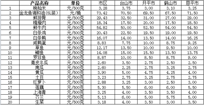 说明:1、表中价格为该地区监测点综合平均价;2、“市区”含蓬江区、江海区、新会区,价格分别采自蓬江市场、江南市场、城东市场等13家农贸市场;3、其他四个县市价格分别采自新华市场、锦江市场等8家农贸市场。