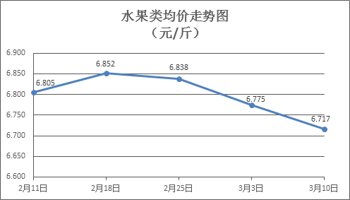 水果类商品价格小幅下降。上周所监测的6种水果商品价格波动情况为5跌1平,综合零售均价为6.717元/斤,环比下降0.86%。其中橙子、苹果、葡萄零售均价分别为每斤5.20元、7.43元、15.33元,环比分别下降0.57%、下降1.20%、下降1.10%。