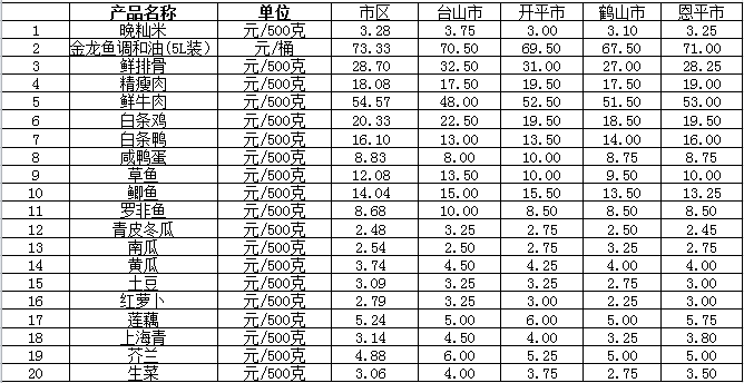 说明:1、表中价格为该地区监测点综合平均价;2、“市区”含蓬江区、江海区、新会区,价格分别采自蓬江市场、江南市场、城东市场等13家农贸市场;3、其他四个县市价格分别采自新华市场、锦江市场等8家农贸市场。