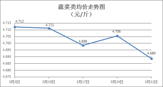 蔬菜类商品价格涨少跌多。所监测的32 种蔬菜商品价格波动情况为11涨18跌5平,综合零售均价为每斤4.689元,环比下降0.36%。其中:涨幅居前的品种包括白苋菜、青尖椒、水空心菜,零售均价分别为每斤4.71元、4.45元、6.59元,环比分别上涨6.80%、3.49%、3.13%;跌幅靠前的品种包括西洋菜、本地菜心、青豆角,零售均价分别为每斤3.70元、4.93元、6.60元,环比分别下降4.64%、下降3.71%、下降2.80%。