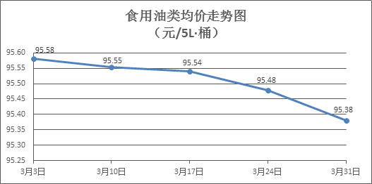 食用油类商品价格微幅下降。所监测的9种食用油(5L装)商品价格波动情况为7跌2平,综合零售均价为每桶95.38元,环比下降0.10%。其中:鲁花花生油、菜籽油零售均价分别为每桶152.60元、73.50元,环比分别下降0.03%、下降0.54%。