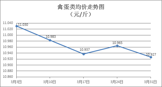 禽蛋类商品价格窄幅盘降。所监测的6种禽蛋类商品价格波动情况为1涨3跌2平,综合零售均价为每斤10.927元,环比下降0.35%。其中:白条鸡、白条鸭零售均价分别为每斤20.19元、14.98元,环比分别下降0.64%、上涨0.07%;白壳鸡蛋、鸭蛋零售均价分别为每斤6.46元、7.65元,环比分别下降0.15%、下降1.29%。