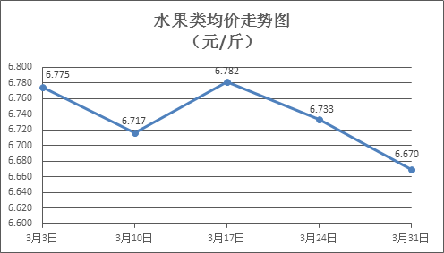 水果类商品价格窄幅波动。所监测的6种水果商品价格波动情况为2涨2跌2平,综合零售均价为每斤6.670元,环比下降0.94%。其中橙子、香蕉、葡萄零售均价分别为每斤5.28元、2.82元、15.12元,环比分别上涨1.54%、下降0.35%、下降3.08%。