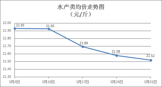水产类商品价格普遍下降。所监测的10种水产商品价格波动情况为1涨8跌1平,综合均价为每斤21.52元,环比下降0.28%。其中:草鱼、鲫鱼、罗非鱼、基围虾零售均价分别为每斤11.32元、14.25元、8.79元、34.34元,环比分别下降0.26%、下降0.28%、下降1.57%、下降0.95%。