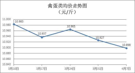禽蛋类商品价格微幅下降。所监测的6种禽蛋类商品价格波动情况为5跌1平,综合零售均价为每斤10.898元,环比下降0.26%。其中:白条鸡、白条鸭零售均价分别为每斤20.14元、14.96元,环比分别下降0.25%、下降0.13%;白壳鸡蛋、鸭蛋零售均价分别为每斤6.46元、7.61元,环比分别持平、下降0.52%。