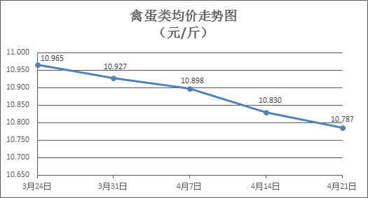 禽蛋类商品价格微幅下降。所监测的6种禽蛋类商品价格波动情况为1涨5跌,综合零售均价为每斤10.787元,环比下降0.40%。其中:白条鸡、白条鸭零售均价分别为每斤19.96元、14.83元,环比分别下降0.45%、下降0.20%;白壳鸡蛋、鸭蛋零售均价分别为每斤6.35元、7.48元,环比分别下降0.78%、上涨0.13%。