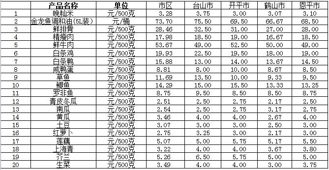 说明:1、表中价格为该地区监测点综合平均价;2、“市区”含蓬江区、江海区、新会区,价格分别采自蓬江市场、江南市场、城东市场等13家农贸市场;3、其他四个县市价格分别采自新华市场、锦江市场等8家农贸市场。