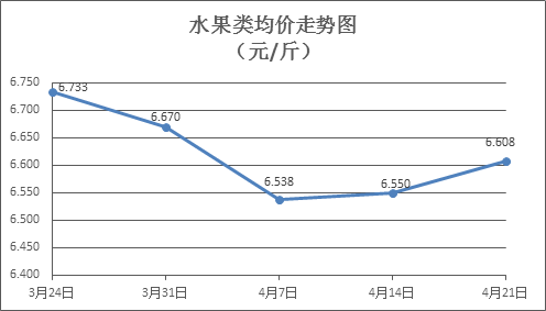 水果类商品价格升降互现。所监测的6种水果商品价格波动情况为3涨3跌,综合零售均价为每斤6.608元,环比上涨0.89%。其中橙子、苹果、香蕉零售均价分别为每斤5.45元、7.39元、2.82元,环比分别上涨0.37%、下降0.40%、下降0.35%。