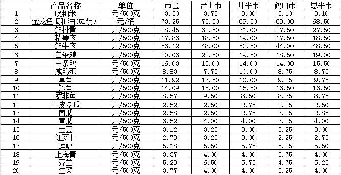 说明:1、表中价格为该地区监测点综合平均价;2、“市区”含蓬江区、江海区、新会区,价格分别采自蓬江市场、江南市场、城东市场等13家农贸市场;3、其他四个县市价格分别采自新华市场、锦江市场等8家农贸市场。