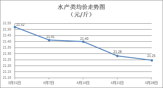 水产类商品价格窄幅盘整。所监测的10种水产商品价格波动情况为7涨3跌,综合均价为每斤21.25元,环比下降0.16%。其中:草鱼、鲫鱼、罗非鱼、基围虾零售均价分别为每斤11.15元、14.25元、8.79元、32.90元,环比分别上涨0.72%、上涨0.42%、上涨0.46%、下降0.72%。