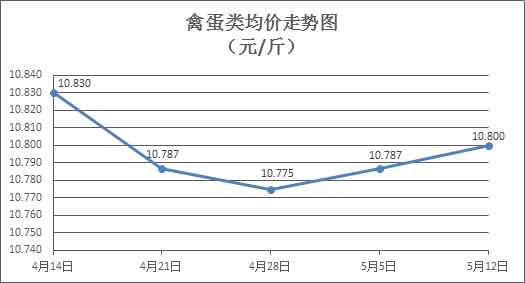 禽蛋类商品价格窄幅盘整。所监测的6种禽蛋类商品价格波动情况为2涨2跌2平,综合零售均价为每斤10.800元,环比上涨0.12%。其中:白条鸡、白条鸭零售均价分别为每斤20.07元、14.94元,环比分别上涨0.65%、持平;白壳鸡蛋、鸭蛋零售均价分别为每斤6.36元、7.48元,环比分别上涨0.63%、下降0.40%。