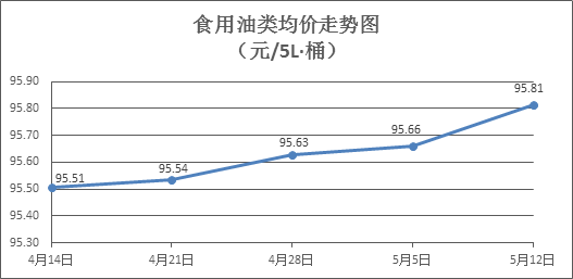 食用油类价格微幅上涨。所监测的9种食用油(5L装)商品价格波动情况为7涨1跌1平,综合零售均价为每桶95.81元,环比上涨0.16%。其中:鲁花花生油、金龙油调和油零售均价分别为每桶154.33元、71.74元,环比分别上涨0.05%、下降0.01%。