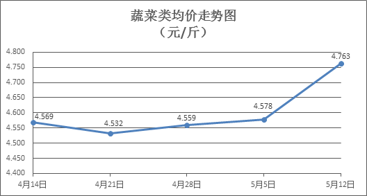 蔬菜类商品价格普涨。所监测的32 种蔬菜商品价格波动情况为28涨3跌1平,综合零售均价为每斤4.763元,环比上涨4.05%。其中:涨幅居前的品种包括生菜、花菜、椰菜,零售均价分别为每斤4.62元、5.13元、2.93元,环比分别上涨21.90%、14.00%、8.12%;跌幅靠前的品种包括黄瓜、水空心菜、蒜苔,零售均价分别为每斤3.60元、4.92元、8.24元,环比分别下降2.44%、1.60%、0.72%。
