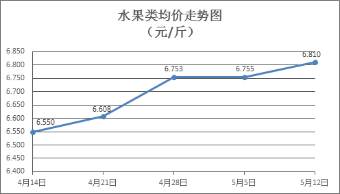 水果类商品价格略有上涨。所监测的6种水果商品价格波动情况为4涨1跌1平,综合零售均价为每斤6.810元,环比上涨0.81%。其中橙子、苹果、葡萄零售均价分别为每斤5.69元、7.45元、15.23元,环比分别上涨2.52%、上涨0.81%、下降0.26%。