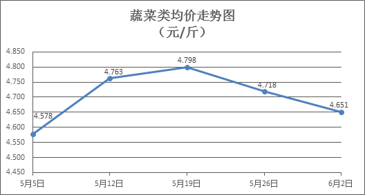 蔬菜类商品价格普遍下降。所监测的32 种蔬菜商品价格波动情况为9涨20跌3平,综合零售均价为每斤4.651元,环比下降1.42%。其中:涨幅居前的品种包括西红柿、莲藕、生姜,零售均价分别为每斤5.04元、5.93元、9.63元,环比分别上涨1.61%、0.85%、0.63%;跌幅靠前的品种包括水空心菜、苦瓜、生菜,零售均价分别为每斤4.17元、4.76元、4.30元,环比分别下降8.95%、8.46%、6.11%。