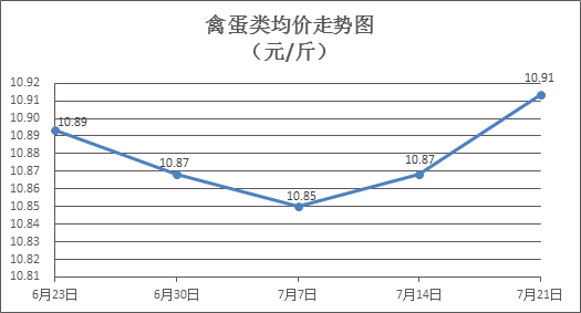 禽蛋类商品价格小幅上涨。所监测的6种禽蛋类商品价格波动情况为4涨1跌1平,综合零售均价为每斤10.91元,环比上涨0.41%。其中:白条鸡、白条鸭零售均价分别为每斤19.99元、15.10元,环比分别下降0.45%、上涨0.40%;白壳鸡蛋、咸鸭蛋零售均价分别为每斤6.48元、9.00元,环比分别上涨1.57%、上涨0.56%。