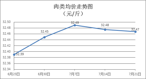 肉类商品价格升降互现。所监测的8种肉类商品价格波动情况为4涨4跌,综合零售均价为每斤32.47元,环比下降0.02%。其中:排骨、精瘦肉、牛肉、带骨羊肉零售均价分别为每斤30.98元、18.78元、46.17元、43.65元,环比分别上涨1.74%、上涨1.46%、下降1.07%、下降0.46%。