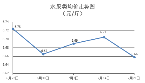 水果类商品价格降多涨少。所监测的6种水果商品价格波动情况为2涨2跌2平,综合零售均价为每斤6.66元,环比下降0.70%。其中橙子、苹果、西瓜零售均价分别为每斤5.66元、7.47元、3.17元,环比分别持平、上涨0.13%、下降1.25%。